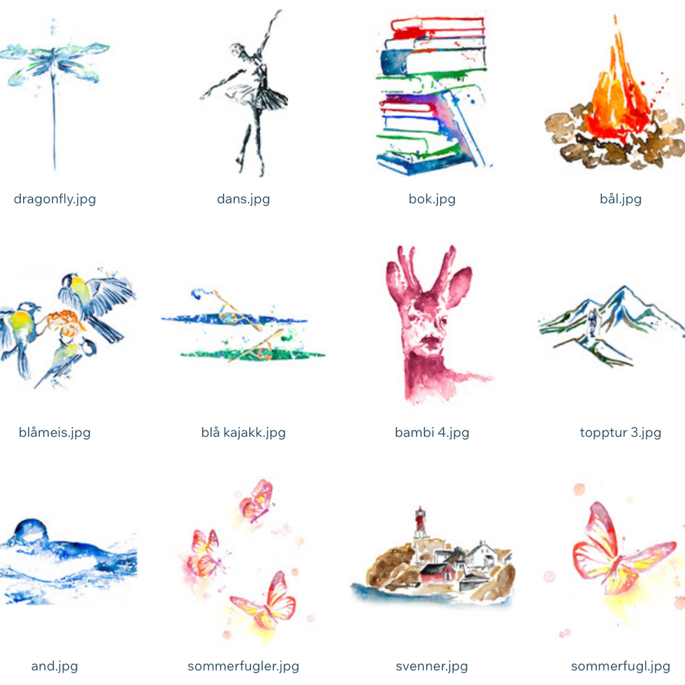 Håndlagde skjerf med motiv malt av Mona Stensholdt. Jeg lager ett og ett skjerf slik at aller er unike, signerte og nummererte. Ønsket tekst kan påføres på den ene enden av skjerfet. Velg motiv fra akvareller på emaljekoppene.